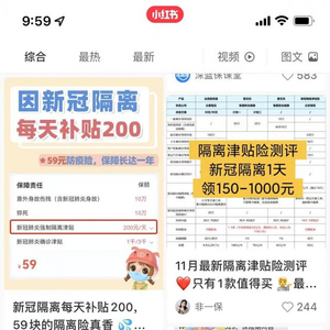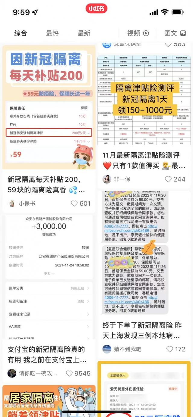 “59元防疫险,居家隔离1天能领200元,一杯奶茶钱保障一年!”“隔离就能赔钱的防疫险安利,旅游拜年出差必备!”“居家隔离也能领钱,这款隔离险真香!”……记者打开小红书APP发现,与“隔离险”相关的笔记有2500余篇。