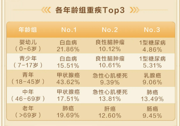 富德生命人寿理赔报告显示,不同年龄组最容易罹患的重疾显著不同: