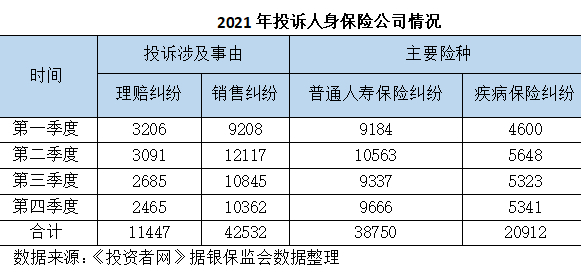 《投资者网》梳理发现,就人身险来看,销售纠纷和理赔纠纷是投诉的主要原因。据统计,在2021年涉及人身险公司的投诉中,销售纠纷4.3万件,占人身险公司投诉总量的44%;理赔纠纷1.1万件,占比12%。其中,普通人寿保险纠纷和疾病保险纠纷占据大头,合计近6万件。