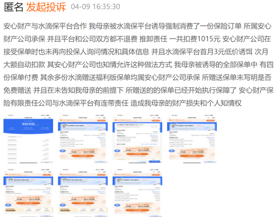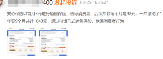 记者以“安心保险”为关键词在黑猫投诉平台上搜索到相关投诉四百多条。其中一条2022年4月9日的投诉称“(安心财险)同水滴保平台共同欺骗群众”,“双方都不退费,推卸责任,一共扣费1015元”,“首月3元低价诱饵,次月大额自动扣款”,并附上保单截图。其中一张产生费用的保单的保障日期是2020年1月11日至2021年1月10日。