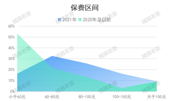 从上图可以看出,2020年及以前,保费小于60元的产品占总产品的一半以上,其余在60-100元区间分布,大于150元的产品占比不到10%。2021年定价小于60元产品显著减少,以60-80元区间占多,其余定价区间均有一定数量产品。2021年总体价格较2020年及以前上涨了不少。