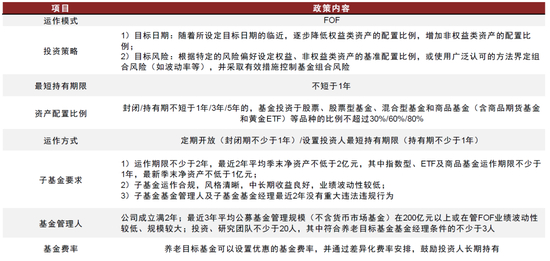 ►以FOF形式运行,包括目标日期策略和目标风险策略。目标日期基金以FOF形式运行,从投资策略上看,包括目标日期策略和目标风险策略。采用目标日期策略的基金,应当随着所设定目标日期的临近,逐步降低权益类资产的配置比例,增加非权益类资产的配置比例。采用目标风险策略的基金,应当根据特定的风险偏好设定权益类资产、非权益类资产的基准配置比例,并采取有效措施控制基金组合风险[7]。