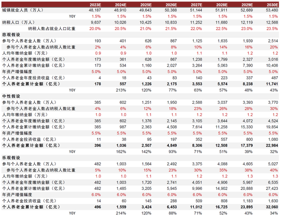 ►个人缴纳:我们通过(城镇就业人数*纳税人数占比*个人养老金参与比例)*个人年度缴纳金额预测。1)过去3年城镇就业人员复合增速1.8%,相较于过去5年/10年2.2%/2.7%的复合增速有所放缓。参考历史增长趋势,我们假设2023-2030年城镇就业人数每年保持1.5%的稳态增速。2)2018年全国纳税人数约6500万人,占城镇就业人数的15%,我们假设至2023年纳税人数占比提升至20%且未来每年提升0.5ppt。3)考虑到个人养老金前期仅在部分城市试点,我们预计前期个人养老金参与比例将较小,未来随着试点逐步开放,参与比例将逐步提升。在悲观/中性/乐观情景下,我们假设2023年纳税人口中个人养老金的参与比例分别为2%/4%/5%,至2030年参与比例分别提升至20%/30%/40%。4)我们假设人均年缴纳金额逐步提升,悲观假设下人均年缴纳金额达到1.1万元/年及以上、中性及乐观假设下人均年缴纳金额达到1.2万元/年及以上需要依赖养老金缴纳上限提高。我们预计至2030年,个人养老金缴纳金额有望达1.0-2.7万亿元,中性假设下为2.0万亿元。