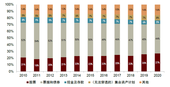 图表:2020年OECD国家第二和第三支柱平均股票资产配置比重为27%