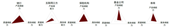 图表:金融机构需要打造产品端、渠道端、服务端三方面能力,各机构先发优势有所差异