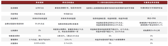 投资属性上看,商业养老保险具有保本属性、养老理财风险较低、养老基金风险和波动更高;服务属性上看,商业养老保险具备相对优势。养老金融产品包括投资属性和服务属性,从投资属性上看,商业养老保险采取保本+浮动收益,适合风险偏好较低的投资者。养老理财和养老基金均为非保本产品,其中养老理财整体投资期限更长、具有较高的业绩比较基准、产品费率低,同时具有风险保障机制以平滑波动,适合中低风险偏好的投资者;养老基金业绩比较基准以相对收益为主,费率更高,对应风险和收益更高,适合中风险及中高风险投资偏好人群。从服务属性上看,保险产品可附加康养等服务,我们预计未来或成为其差异化的竞争点。