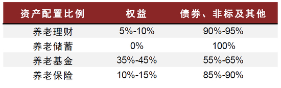 预计我国早期产品配置以银行产品为主,长期看银行产品将部分分流至养老保险及养老基金: