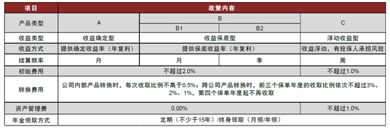 ►分为不同类型产品,满足不同客户需求。税延型养老保险按照积累期收益类型划分为A、B、C类:A类为收益确定型产品,即在积累期提供确定收益率(年复利),每月结一次收益;B类为收益保底型产品,即在积累期提供保底收益率(年复利),同时可根据投资情况提供额外收益;C类为收益浮动型产品,即在积累期按照实际投资情况结算,至少每周结算一次。从产品实际情况看,A类产品保证利率大多为3.5%、B类产品保底利率普遍为2.5%。以太保人寿为例,A、B类产品对收益设定保证/保底利率3.5%/2.5%;C类产品采取稳健增值型投资策略,提供浮动收益,以固收及非标债权资产为主,适合中度风险偏好且具有一定收益要求的投资者。