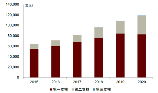我国现行养老体系包括三支柱,第一支柱包括由政府主导的城镇职工基本养老保险和城乡居民基本养老保险,此外,全国社保基金作为补充来源,用于人口老龄化高峰时期的养老保险等社会保障支出的补充、调剂;第二支柱是由单位主导的职业养老金,包括企业年金和职业年金;第三支柱是由个人主导的个人养老金。截至2020年,我国第一支柱规模8.3万亿元(5.8万亿元基本养老保险和2.5万亿元全国社保基金),第二支柱规模3.5万亿元(2.2万亿元企业年金和1.29万亿元职业年金);第三支柱规模594亿元(590亿元养老目标基金和4亿元个人税收递延型养老保险),2020年第一、二、三支柱占比分别为69.7%、29.8%、0.5%。