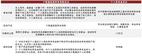 图表:个人养老金试点相较个税递延型养老保险试点在参加对象、投资产品、年缴纳上限方面均有所优化
