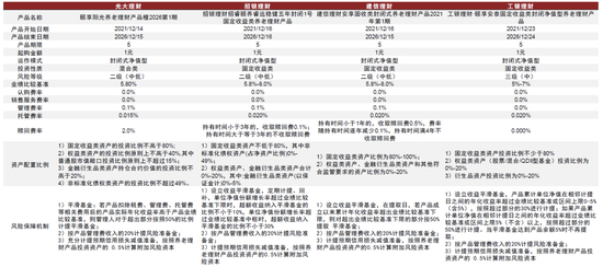 ►投资期限长,业绩比较基准较高。首批试点的4只产品均为封闭净值型产品,产品投资期限均为5年,相较2021年12月全市场新发封闭式产品481天的加权平均期限,养老理财产品在投资期限上显著拉长,更侧重长期保值。产品业绩比较基准较高,4只产品整体在5%-8%之间(vs. 2021年各月度银行理财产品加权平均年化收益率最高为3.97%、最低为2.29%)。此外,在提前赎回方面,招银理财及建信理财养老产品规定投资者罹患重大疾病或购房可提前赎回产品,工银理财及光大理财养老产品在投资者患重大疾病时可提前赎回。