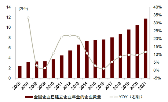 图表:2018-2021年建立企业年金的公司数量从8.7万家增至11.8万家,CAGR10%