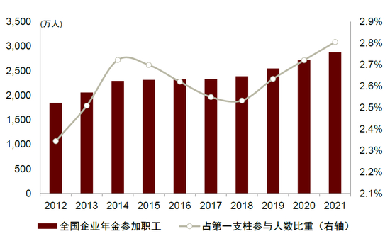 图表:企业年金覆盖率较低,2021年参加企业年金的人数占第一支柱参与人数比重仅2.8%