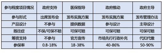 目前,虽然各地政策参与程度不一,但整体参与模式主要分为政府支持、医保指导、政府推动和政府主导4种。