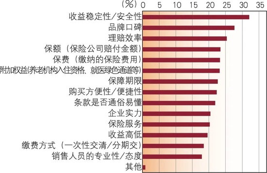 从购买传统寿险看重的因素看,受访者认为收益稳定性/安全性、品牌口碑和理赔效率是比较重要的因素,选择这三项的占比分别为32.06%、27.6%和25.31%(见图11)。