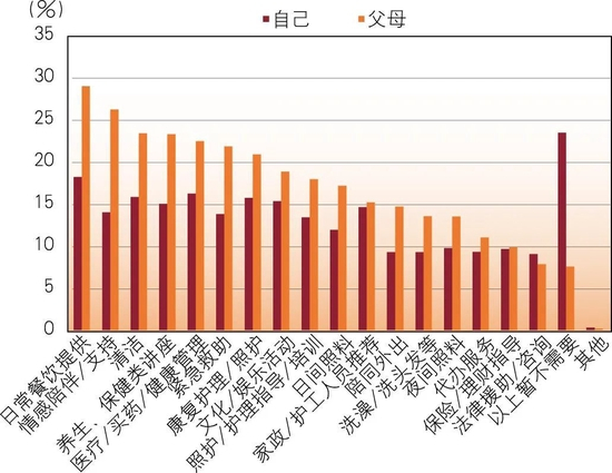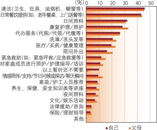 在付费养老服务需求方面,清洁、日常餐饮提供和日间照料是城市居民为自己和父母选择较高的三项付费服务,前两项占比为40%以上,第三项占比在30%左右(见图10)。