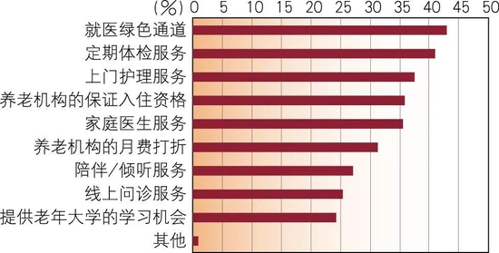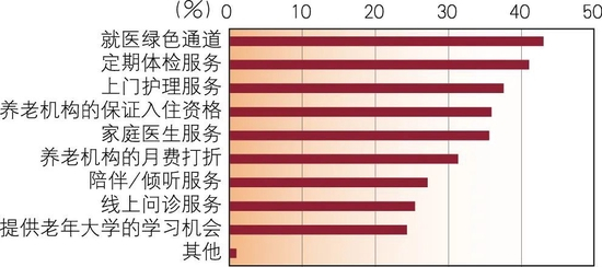 对于将养老保险与养老社区优先入住权结合的模式,有83%的受访者表示优先入住权会增加购买养老保险的可能性,说明如果条件允许,大部分居民有入住养老社区的意愿。关于保险公司提供哪些服务会增加购买养老保险的可能性,受访者希望增加的服务占比较高的包括就医绿色通道、定期体检服务和上门护理服务,分别为43%、41.03%和37.54%,养老机构的保证入住资格和家庭医生服务占比分别为35.87%和35.57%,反映了居民对于老年阶段的就医、体检、医疗护理以及与之相关的入住养老机构有较大的需求(见图14)。