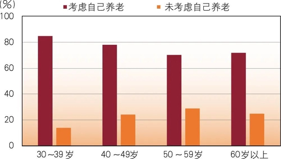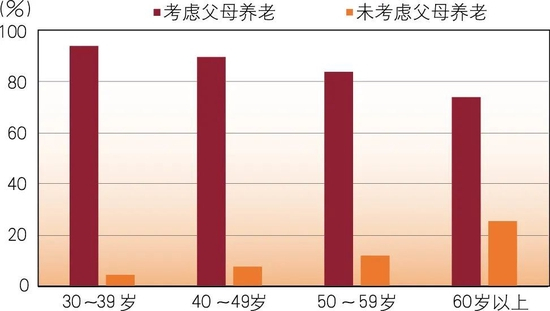 调查结果显示,从整体上看,有77.5%的受访者考虑过自己的养老问题。在父母有一方或双方健在的受访者中,有82%的受访者考虑过自己和父母的养老问题。在各个年龄阶段的受访者中,已经开始考虑自己养老问题的受访者占比均超过75%。在父母有一方或双方健在的受访者中,各个年龄阶段考虑父母养老问题的受访者占比也超过了75%(见图1、图2)。