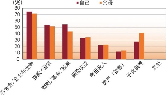 在可以支付养老费用的来源方面,受访者及其父母可以用来支付养老费用的资金来源于国家养老金(退休金/养老金/企业年金等)的最高,在70%以上;然后是理财、存款,均在40%以上(见图5)。