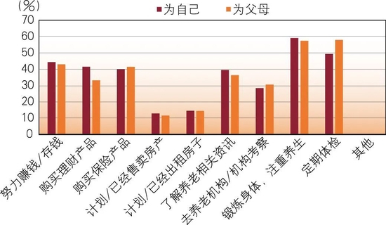 但是,大部分受访者对自己及父母的养老问题都进行了规划。其中,对自己的养老有规划和行动的受访者有44.5%,有规划但还没有行动的有33.5%,依然有22%的受访者对自己的养老没有规划;有72%的受访者对于父母的养老问题有规划和行动,28%的受访者对于父母的养老问题没有具体行动,有5%的受访者对父母的养老没有规划和行动。