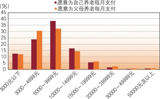 在受访者愿意为自己和父母养老每月支付的机构养老费用方面,占比最高的是5000~7999元,其次是3000~4999元,第三是8000~9999元;前两项中,愿意为自己支付的金额占比低于愿意为父母支付的金额占比。从统计结果可以看出,城市居民愿意为自身和父母每月支付的机构养老费用大部分集中在3000~10000元,选择这个区间的受访对象在70%以上。