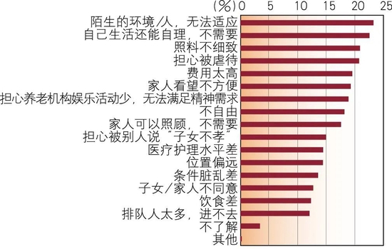 从养老方式的选择看,受访者为自己和父母选择机构养老的占比较低。调查组进一步了解了不选择机构养老的原因。结果显示,排在前三位的是无法适应陌生环境与人;自己生活还能自理不需要以及照料不细致,占比分别为23.28%、22.58%和20.91%(见图7)。
