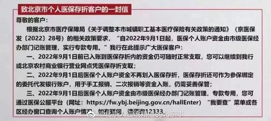 根据北京市医疗保障局《关于调整本市城镇职工基本医疗保险有关政策的通知》(京医保发〔2022〕28号)的相关政策要求,“自2022年9月1日起,医保个人账户资金由市级医保经办部门记账管理,实行专款专用。”我行在此提示广大医保客户: