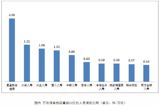 2.复星联合健康的万张保单投诉量位列人身保险公司第一。2022年第二季度,人身保险公司万张保单投诉量中位数为0.25件/万张。其中,万张保单投诉量居前10位的为:复星联合健康2.06件/万张;三峡人寿1.21件/万张;长生人寿1.08件/万张;爱心人寿1.02件/万张;中韩人寿0.86件/万张;百年人寿0.63件/万张;富德生命人寿0.59件/万张;陆家嘴国泰人寿0.59件/万张;瑞华保险0.57件/万张;同方全球人寿0.54件/万张。