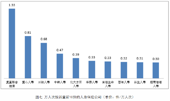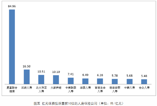 1.复星联合健康的亿元保费投诉量位列人身保险公司第一。2022年第二季度,人身保险公司亿元保费投诉量中位数为1.78件/亿元。其中,亿元保费投诉量居前10位的为:复星联合健康84.96件/亿元;三峡人寿16.50件/亿元;北大方正人寿10.51件/亿元;大家养老10.10件/亿元;中美联泰人寿7.41件/亿元;华泰人寿6.49件/亿元;富德生命人寿6.28件/亿元;德华安顾人寿5.78件/亿元;中韩人寿5.68件/亿元;合众人寿5.48件/亿元。