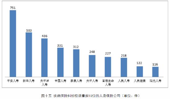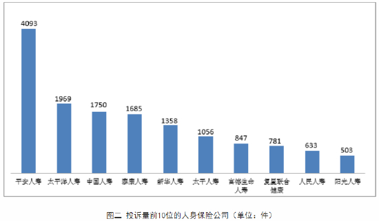(二)平安人寿投诉量位列人身保险公司第一。人身保险公司投诉量居前10位的为:平安人寿4093件,占人身保险公司投诉总量的22.12%;太平洋人寿1969件,占比10.64%;中国人寿1750件,占比9.46%;泰康人寿1685件,占比9.11%;新华人寿1358件,占比7.34%;太平人寿1056件,占比5.71%;富德生命人寿847件,占比4.58%;复星联合健康781件,占比4.22%;人民人寿633件,占比3.42%;阳光人寿503件,占比2.72%。