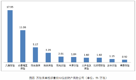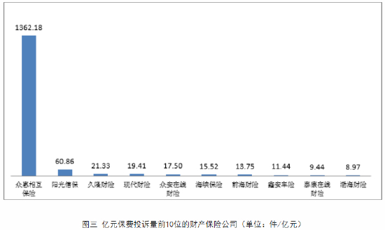(一)人保财险、众惠相互保险的投诉量位列财产保险公司前两位。财产保险公司投诉量居前10位的为:人保财险2164件,占财产保险公司投诉总量的21.53%;众惠相互保险1971件,占比19.61%;众安在线财险972件,占比9.67%;平安财险621件,占比6.18%;太平洋财险514件,占比5.11%;阳光财险374件,占比3.72%;国寿财险337件,占比3.35%;大地财险323件,占比3.21%;中华财险314件,占比3.12%;泰康在线财险235件,占比2.34%。