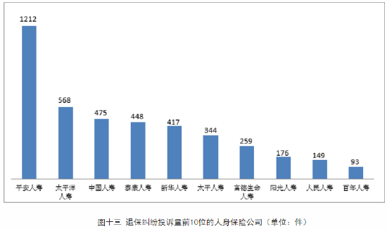 2.平安人寿的退保纠纷投诉量位列人身保险公司第一。人身保险公司退保纠纷投诉量居前10位的为:平安人寿1212件,占平安人寿投诉总量的29.61%;太平洋人寿568件,占比28.85%;中国人寿475件,占比27.14%;泰康人寿448件,占比26.59%;新华人寿417件,占比30.71%;太平人寿344件,占比32.58%;富德生命人寿259件,占比30.58%;阳光人寿176件,占比34.99%;人民人寿149件,占比23.54%;百年人寿93件,占比27.68%。