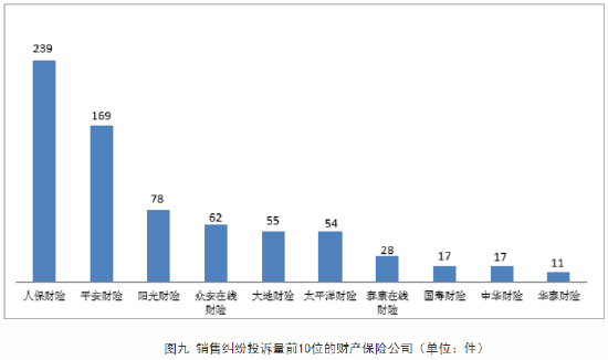 2.人保财险、平安财险的销售纠纷投诉量位列财产保险公司前两位。财产保险公司销售纠纷投诉量居前10位的为:人保财险239件,占人保财险投诉总量的11.04%;平安财险169件,占比27.21%;阳光财险78件,占比20.86%;众安在线财险62件,占比6.38%;大地财险55件,占比17.03%;太平洋财险54件,占比10.51%;泰康在线财险28件,占比11.91%;国寿财险17件,占比5.04%;中华财险17件,占比5.41%;华泰财险11件,占比15.07%。