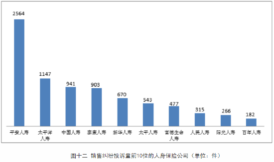 1.平安人寿的销售纠纷投诉量位列人身保险公司第一。人身保险公司销售纠纷投诉量居前10位的为:平安人寿2564件,占平安人寿投诉总量的62.64%;太平洋人寿1147件,占比58.25%;中国人寿941件,占比53.77%;泰康人寿903件,占比53.59%;新华人寿670件,占比49.34%;太平人寿543件,占比51.42%;富德生命人寿477件,占比56.32%;人民人寿315件,占比49.76%;阳光人寿266件,占比52.88%;百年人寿182件,占比54.17%。