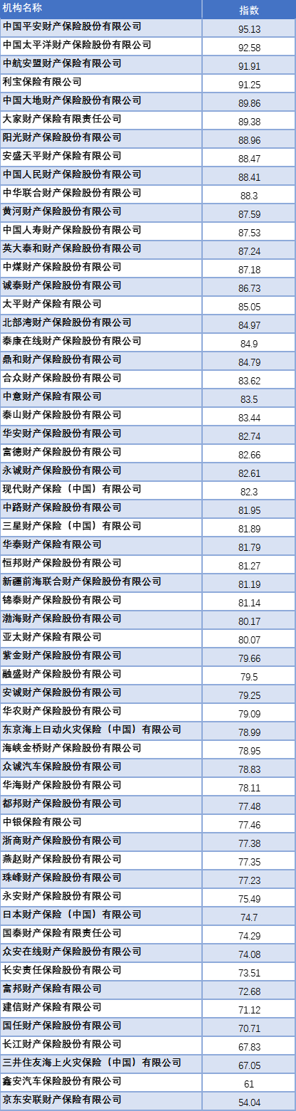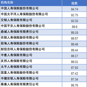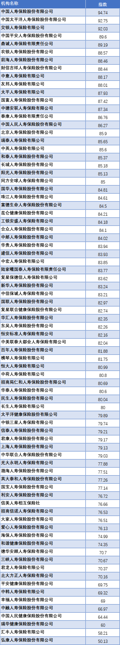 榜单中,服务质量指数高于90的保险公司包括中国人寿、太保寿险、交银人寿以及平安产险、太保产险、中航安盟财险、利宝保险。保险服务质量指数低于60的保险公司包括汇丰人寿、弘康人寿及京东安联财险。