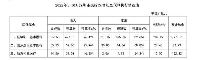 深圳市医疗保障局公布的《2022年1-10月深圳市医疗保险基金预算执行情况表》显示,截至今年10月,深圳城镇职工基本医疗保险当期结余207.49亿元,累计结余1770.75亿元。
