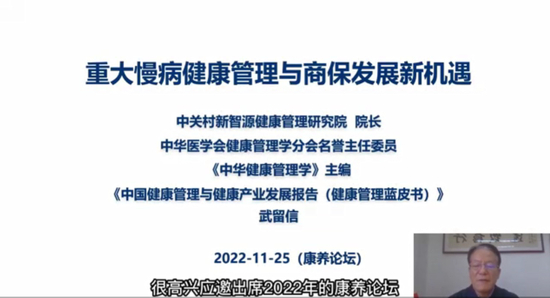 主题发言环节由新产业创投集团康养产业运营公司总经理兰波主持。受疫情影响,深圳大学风险管理与保险系副教授王晓玲与中关村新智源研究院院⻓、教授武留信作了线上演讲。王晓玲发布了2022中国保险康养产业年度报告,武留信为大家重点解读了重大慢性病健康管理与商保健康管理融合发展的新机遇。