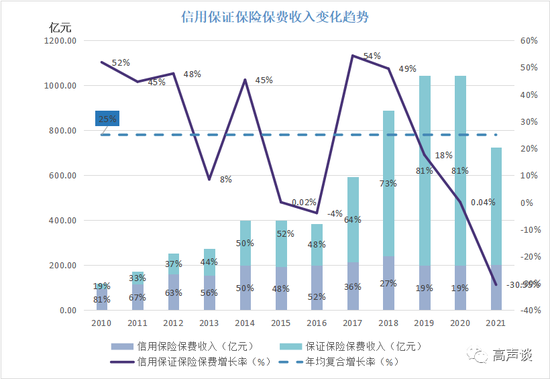 2021年,我国信保行业整体保费收入实现725亿元,较2020年的1044亿元少收319亿元,环比下降30.5%。其中,信用险收入203.85亿元,环比增加3.42亿元,连续三年稳步增长;导致整体保费下降的主要原因是保证险的波动:2021年保证险保费收入为521.2亿元,环比少收322.3亿元。