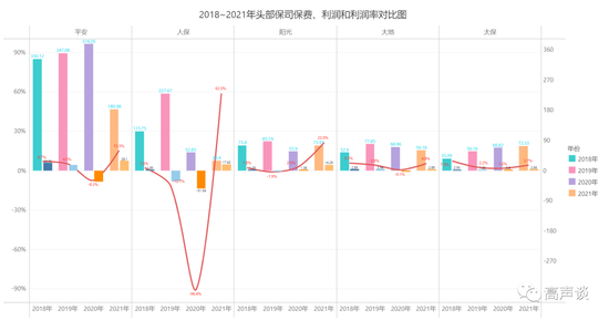 下图显示了5家保司连续4年的保费收入(长柱)、利润(短柱)和利润率(折线,=利润/保费收入)。从2021年利润看,5家保司无一不实现了盈利:平安虽然新增业务和保费收入减半,但利润实现了扭负为正,甚至比前三年都高;人保同样扭转了连续两年的亏损状态,同样实现了近4年的最好盈利,利润增速是5家保司中最高的;阳光、大地、太保的利润环比均实现了正增长,增速均呈现良好态势。