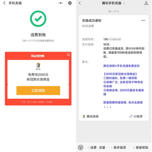 近日,探长读财通过微信“手机充值”充话费发现,话费到账的同时,微信手机充值页面提示“免费领2000元新冠肺炎保障金”。与此同时,腾讯手机充值也提示,腾讯微保×手机充值免费送你【2000元新冠肺炎保障金】。