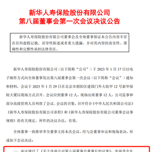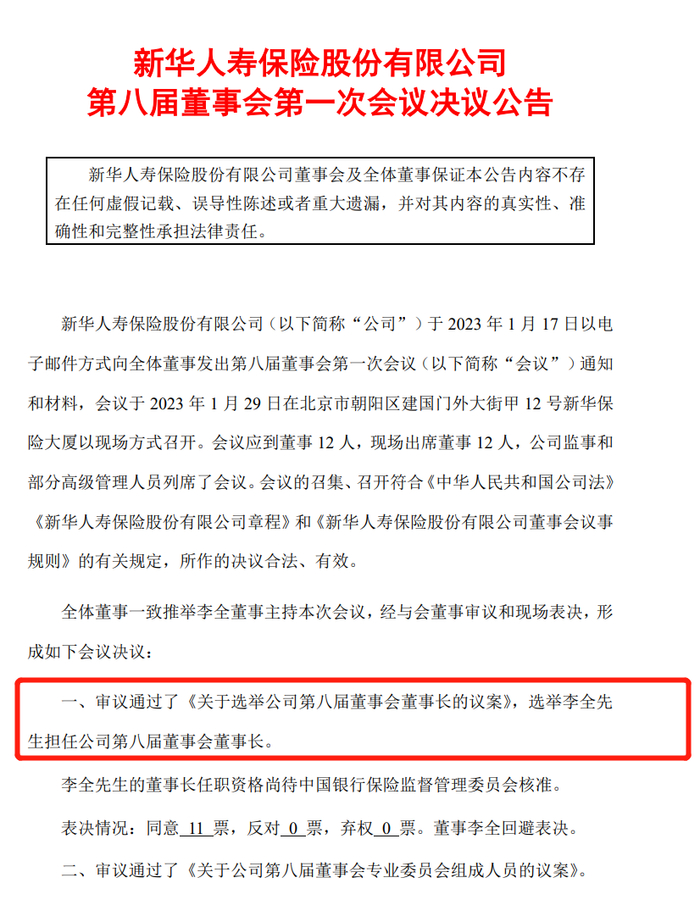 1月30日,兔年开工第三天,新华保险发布第八届董事会第一次会议决议公告,选举李全担任新华保险第八届董事会董事长,该任职资格尚待银保监会核准。
