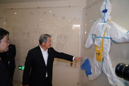 现在泰康同济B栋9楼还有一小片区域,几乎原封不动地保留了3年前收治新冠患者时的样子。正月初九我去医院慰问泰康同济的医护人员,第一次看到用简陋木板隔离出的三区两道,A4纸简单打印张贴的穿脱防护服流程,以及医护人员画在墙上的涂鸦、签名与防护服时,情不自禁向他们鞠躬致敬。