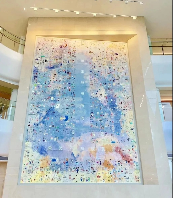 医护人员的这些涂鸦和签名,成为艺术家创作《用生命书写的希波克拉底誓言》巨幅壁画的灵感和核心元素。这幅高9.9米、宽6.57米的抗疫纪念丰碑,现在耸立在泰康同济大堂入口处,以天空般梦幻的色彩为基调,结合医护人员略显稚拙的简笔画图案,包容、温柔,抚慰人心。壁画的底座上,整整齐齐镌刻着1993个参与医院抗疫医护和工作人员的名字,永远纪念这些勇敢的人,纪念这群抗疫英雄。