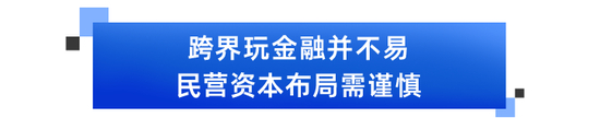 对于民营企业跨界打造综合金融平台的挑战,浙江大学国际联合商学院数字经济与金融创新研究中心联席主任、研究员盘和林就分析称,近年来,金融业进入强监管周期,监管正大力引导金融机构转型高质量发展,过去部分地产公司等民企,希望通过布局金融板块为自身融资输血,或弯道超车谋求转型的模式已难以实现。并且,金融业本身具有较高的专业门槛,且需较强的风险控制能力,而很多民营企业培育跨行业的专业能力,实际非常困难,通常只有少数企业能够成功。