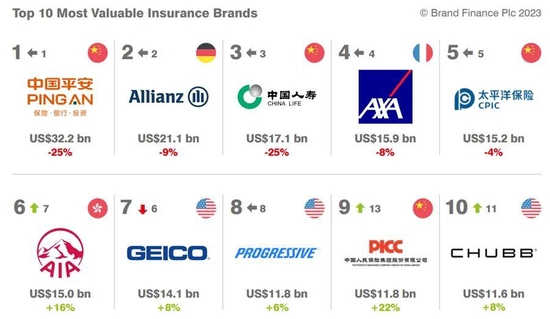 2023全球保险品牌价值100强排行榜:5家机构进入榜单前十,中国平安位列第一