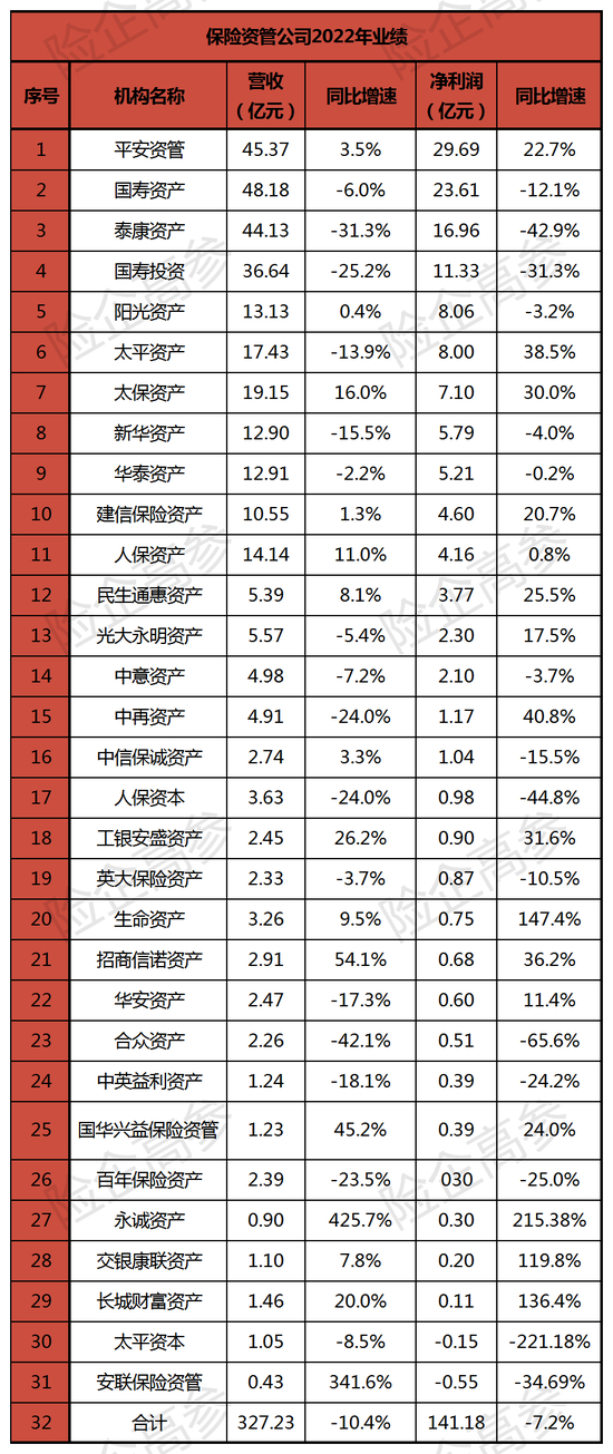 在大资管时代,保险资管机构发展较快,国寿资产、平安资管、泰康资产、太保资产、人保资产、太平资产、新华资产、大家资产8家机构资管管理规模已破万亿。在31家保险资管公司数据中,合计营收达327.23亿元,合计净利润达141.18亿元,相比2021年分别下滑了10.4%和7.2%。