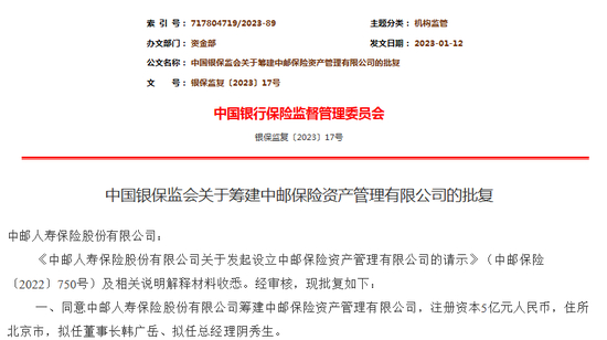 1月19日,银保监会官网发布消息称,批复同意中邮人寿保险股份有限公司筹建中邮保险资产管理有限公司,注册资本5亿元人民币,拟任董事长韩广岳、拟任总经理阴秀生。