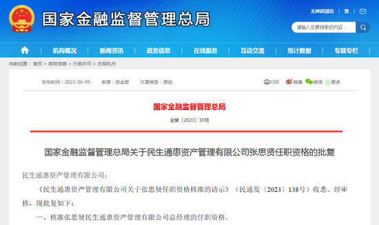 6月9日,国家金融监督管理总局批复的高管任命中,乾志担任中再资产董事长,张思贤担任民生通惠资产总经理。