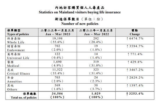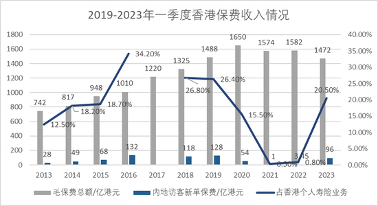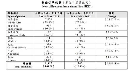 由于跨境人流恢复保障需求释放,加上2022年同期基数较低,2023年一季度内地访客新造业务保费高达96亿港元,较2022年同期上升2686.4%,即同比近27倍,占到香港个人寿险业务总新单保费的20.5%左右。