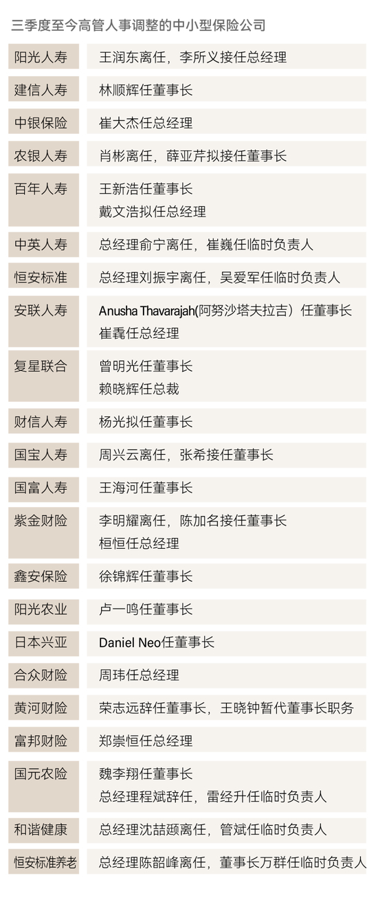 相较于头部险企,三季度中小型险企的人事调整更加频繁,其中既有阳光人寿、百年人寿、紫金财险、合众财险等具备相当体量与规模的中型险企,也有建信人寿、中银保险、中英人寿等银行系、外资、合资险企,还包括国富人寿、复星联合、富邦财险等规模较小的保险公司。